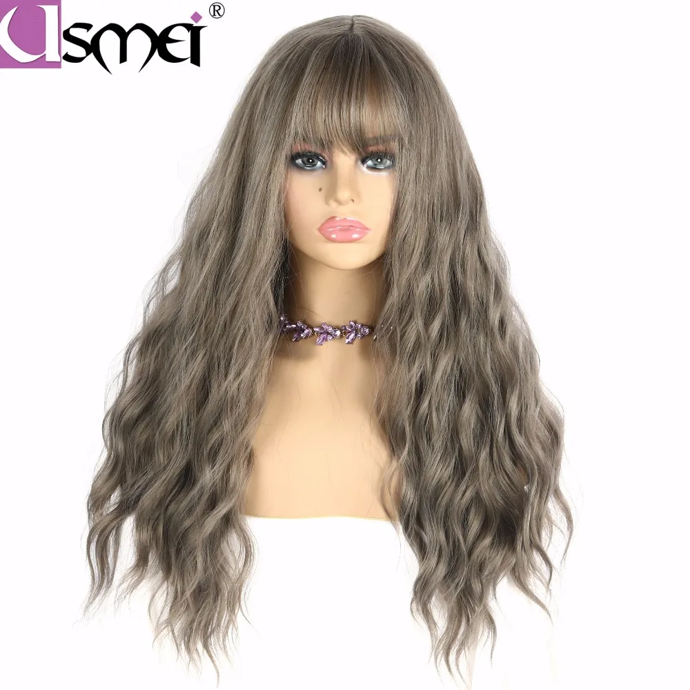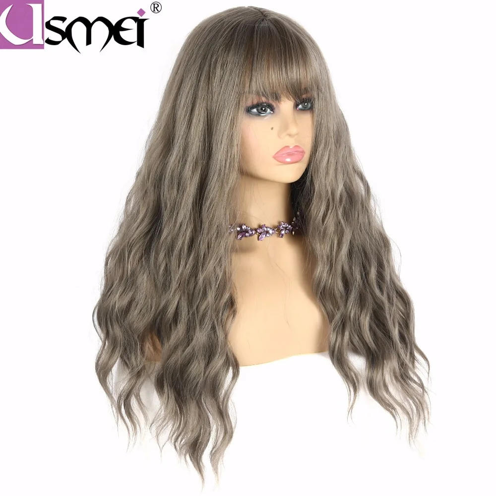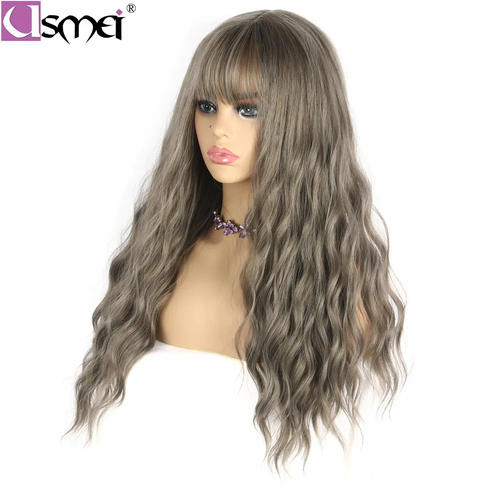TOP USMEI Hair thin bangs Long gray natural wave Wig Synthetic Wigs Black brown 28inch High Temperature