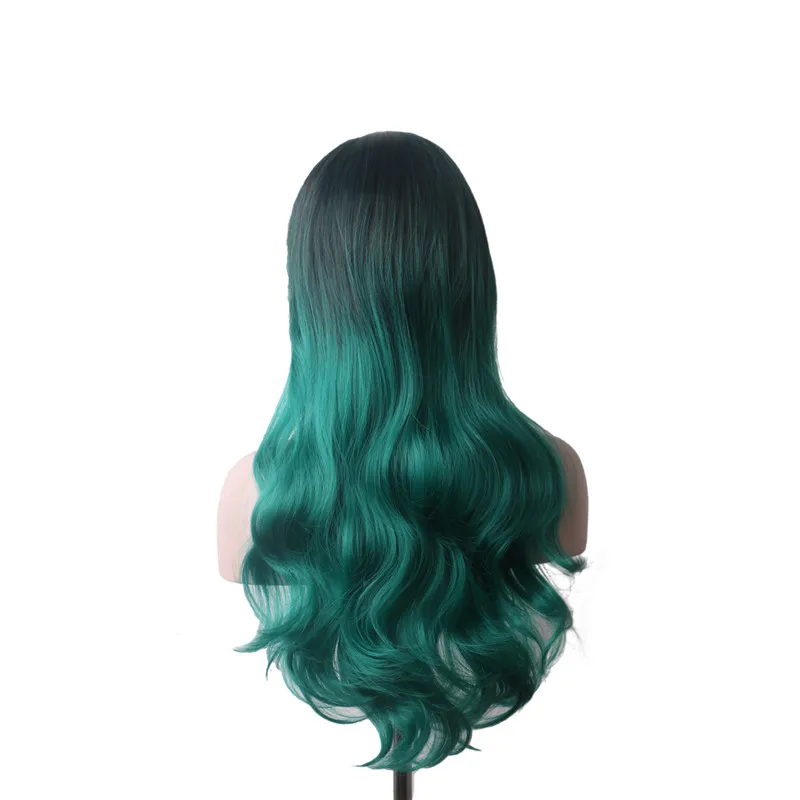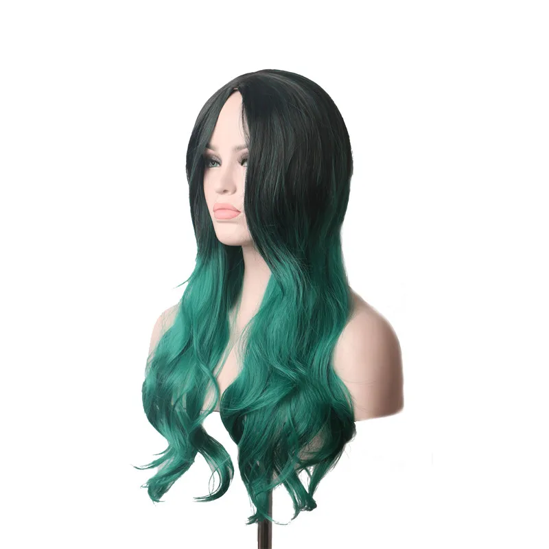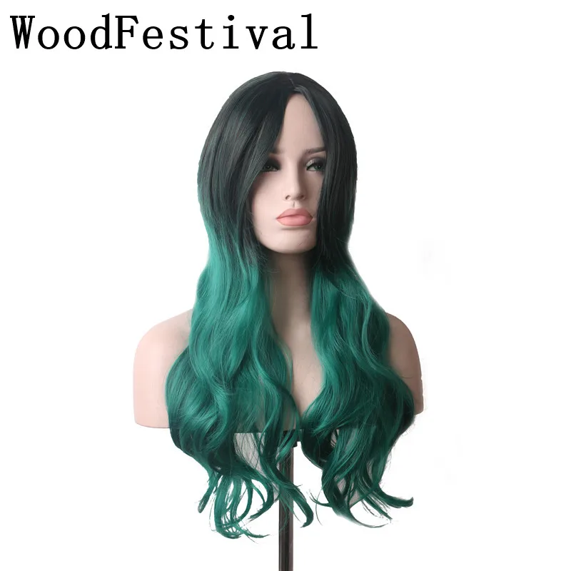 WoodFestival Black to Green High Temperature Fiber Cosplay Wig Long Wavy Women Heat Resistant Synth