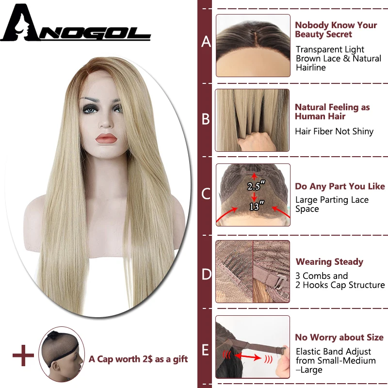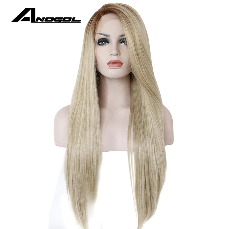 HOT SALE Anogol High Temperature Fiber Glueless Long Straight Ombre Brown to Blonde Synthetic Lace Front Wig