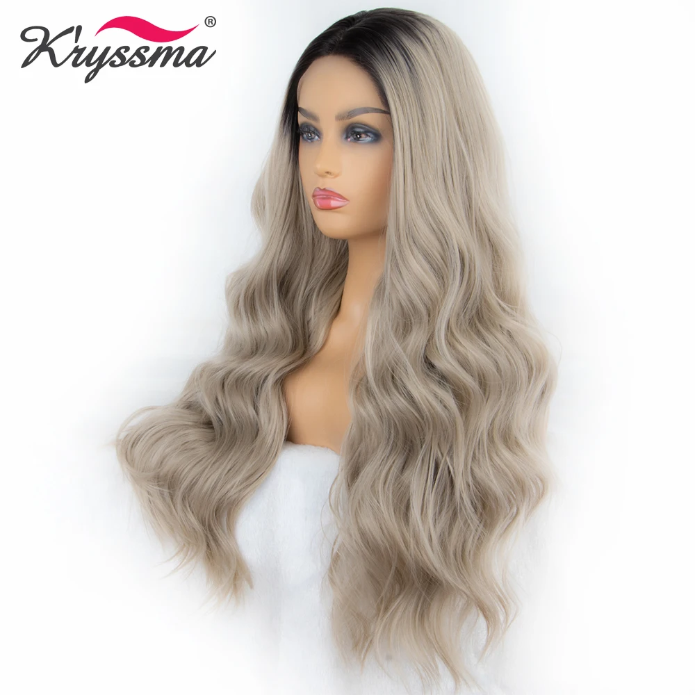Platinum Blonde Wig Synthetic Lace Front Ombre Wig Dark Roots Long Wavy Wigs for Women Two Tones 22