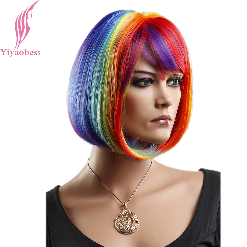 Yiyaobess 12inch Synthetic Hair Short Rainbow Wig With Bangs Colorful Cosplay Wigs For Women Japane