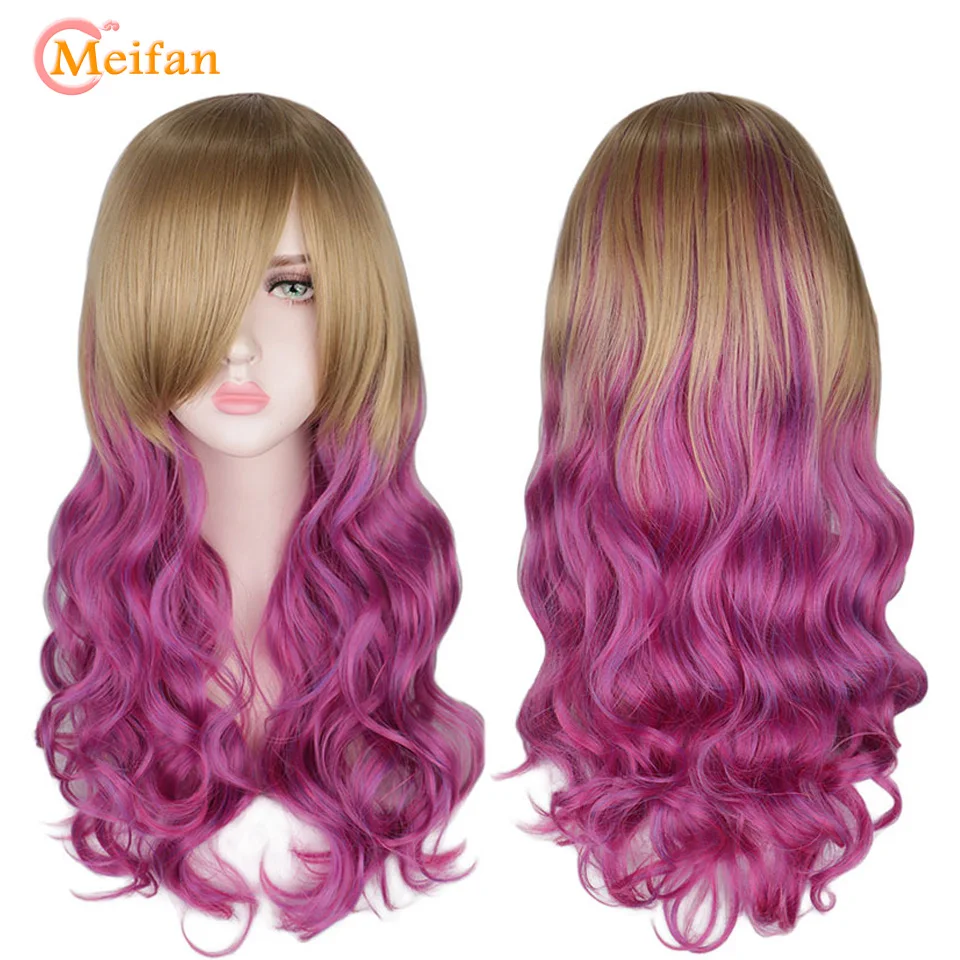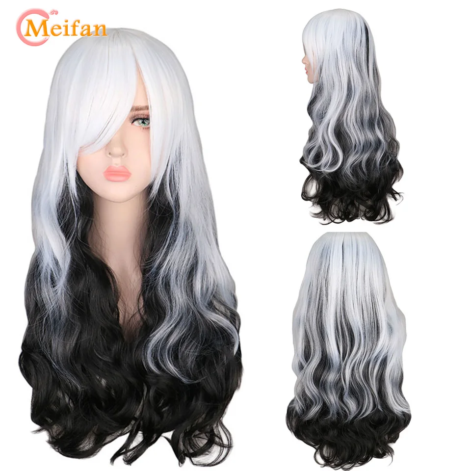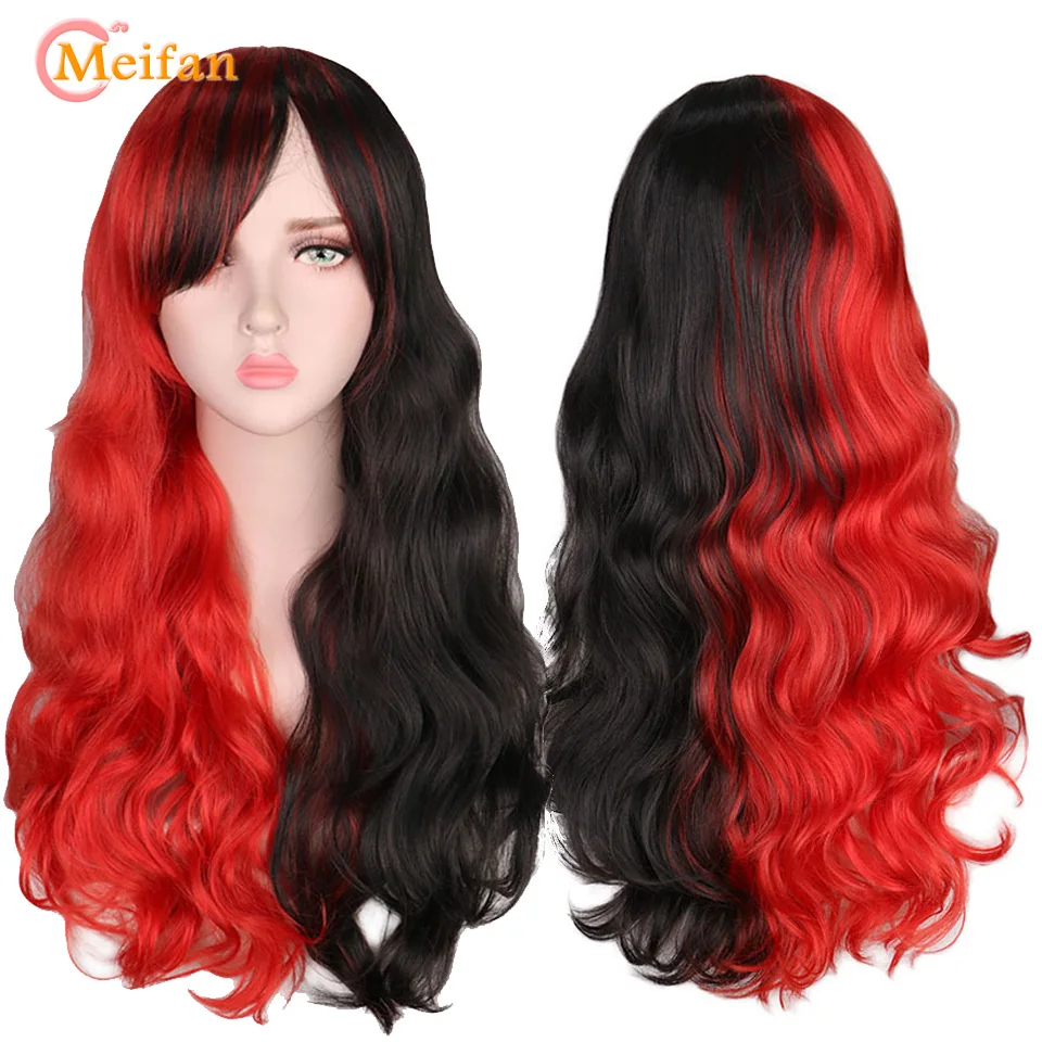 HOT Sale MEIFAN Half Black Half Red Cosplay Anime Wavy Curly Party Women Heat Resistance Synthetic Costume O